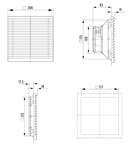 Ανεμιστήρας πίνακος 177x177mm με φίλτρο και περσίδα 204x204mm, 105-126m³/h, IP 54, RAL 7035
